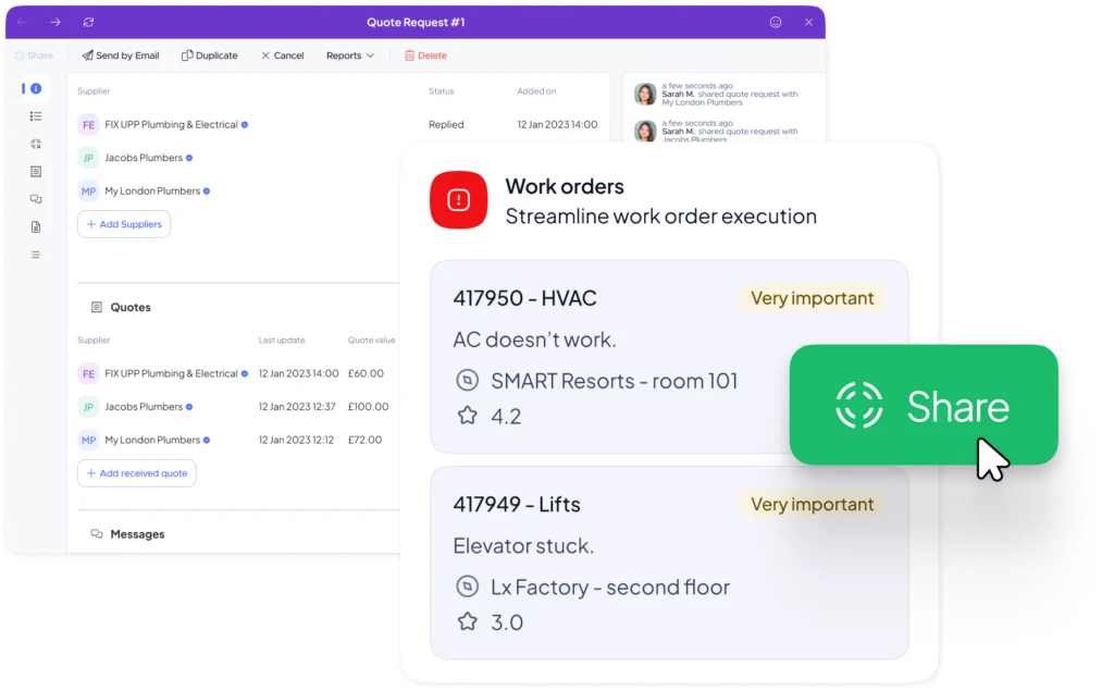 Facilities managers and suppliers can share real-time updates, send documents, and exchange images through in-app messaging, so that both parties remain aligned throughout the procurement and service execution process. Additionally, the platform simplifies the process of requesting, comparing, and approving quotes, reducing back-and-forth communication and expediting decision-making.