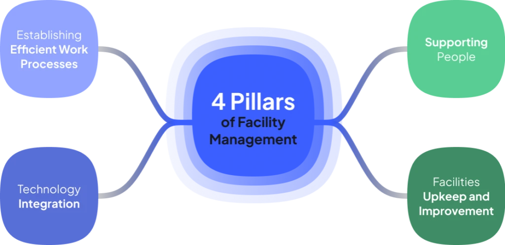In order to be successful, facility management requires a strategic and systematic approach to the handling of a company’s assets. The four main pillars of facility management are: