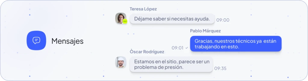 Los facility managers y los proveedores pueden compartir actualizaciones en tiempo real, enviar documentos e intercambiar imágenes a través de los mensajes en la aplicación, de modo que ambas partes permanezcan alineadas durante todo el proceso de adquisición y ejecución del servicio. Además, la plataforma simplifica el proceso de solicitud, comparación y aprobación de presupuestos, reduciendo el va y viene comunicativo y agilizando la toma de decisiones.