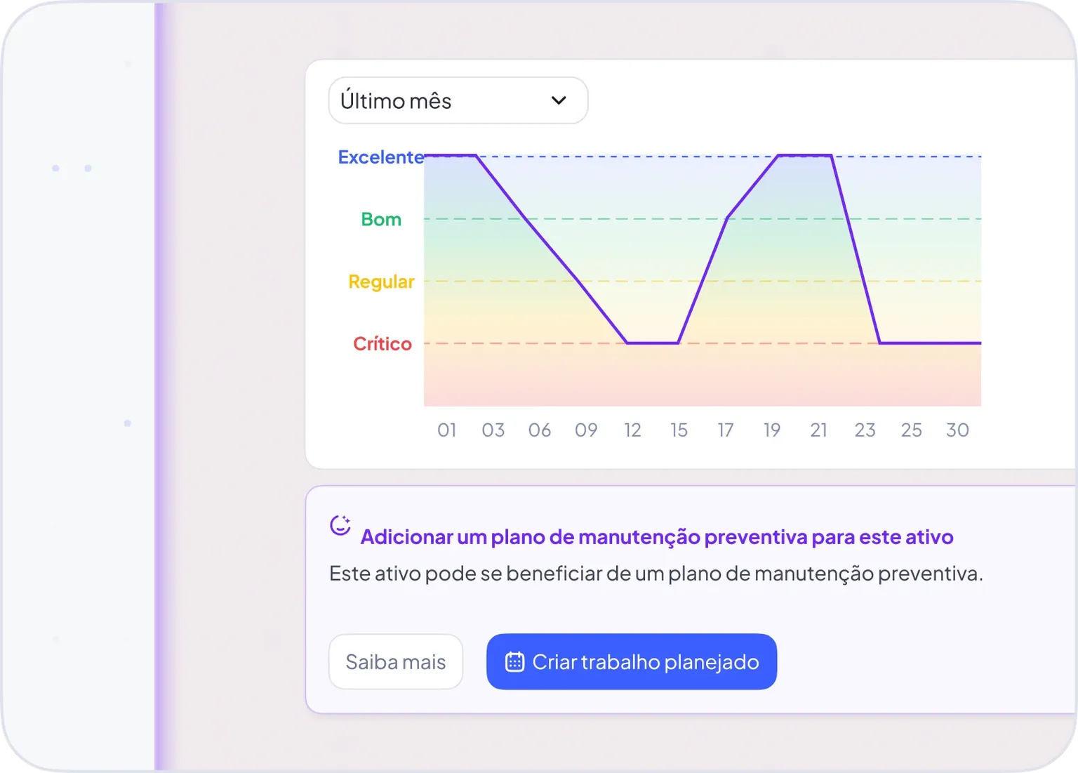 Com IA, obtenha pontuações de saúde dos ativos e indicadores essenciais e detecte riscos antecipadamente.