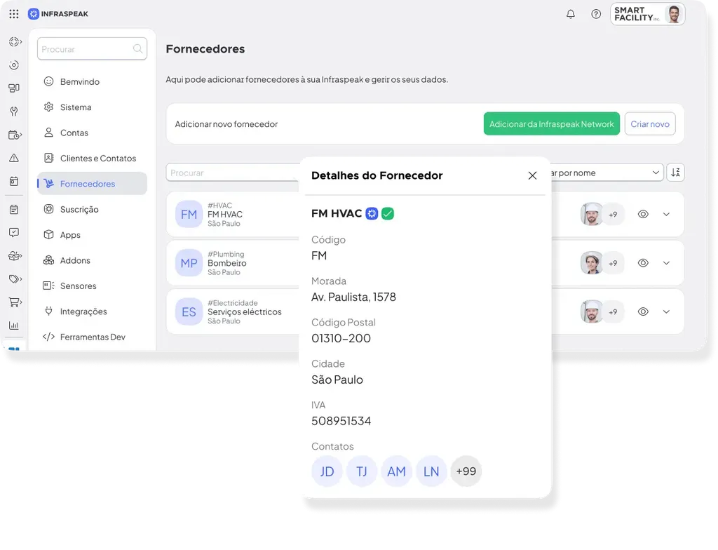Os dias das chamadas telefônicas e e-mails intermináveis acabaram. Com a Infraspeak Network™, gestão de instalações e prestadores de serviços ficam conectados e compartilham um espaço de trabalho único, aumentando a produtividade ao longo de todo o processo.
