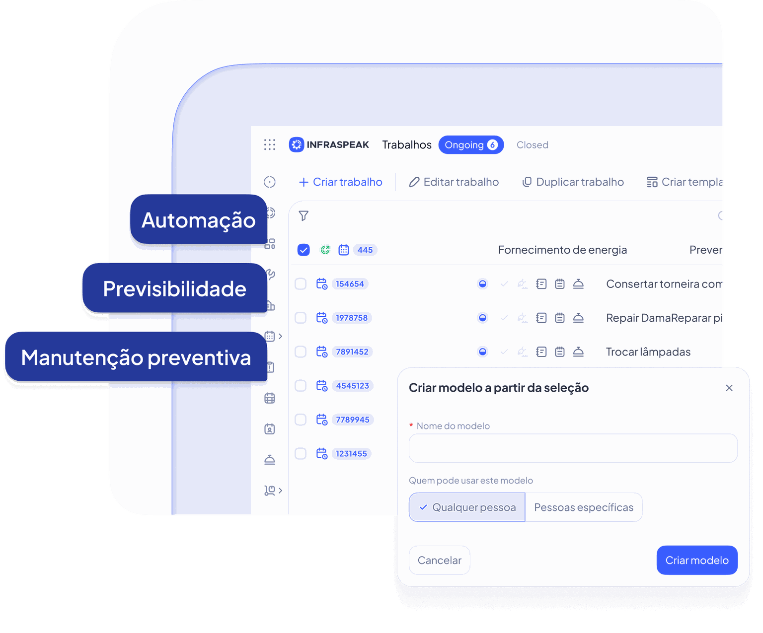 Vamos mostrar como a Infraspeak pode ajudar sua equipe a alcançar visibilidade total, mais eficiência e controle em toda a sua operação.